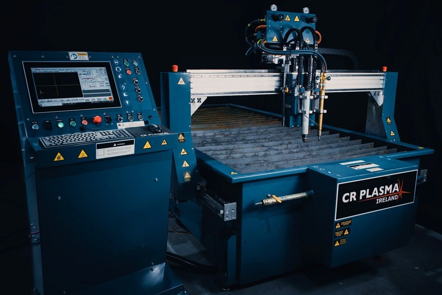The CR PLASMA system has all the required control capacity to fully manage an Oxy Acetylene cutting head. The controller can run a dual process head by switching between a plasma process and an Oxy process in the one system. Typically Oxy cutting comes into its own on much thicker steel parts where the power required to run a plasma becomes prohibitive to its installation and cost to run
